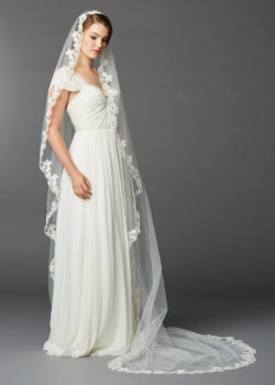 Our sumptuous Cathedral Mantilla bridal veil is embellished top to bottom with bold scalloped lace. Boasting pearls, sequins and iridescent sequins, this best selling Cathedral Mantilla veil will add luxurious style to any wedding gown.