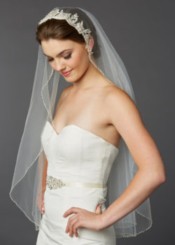 Mariell’s best selling Fingertip Bridal Veil is 36″ L x 60″ W. Our One Layer veil has embellished silver lace adorning the head making it a veil and headpiece in one. The veil cascades with shimmery bugle edging. Add luxe glamour to your wedding gown!