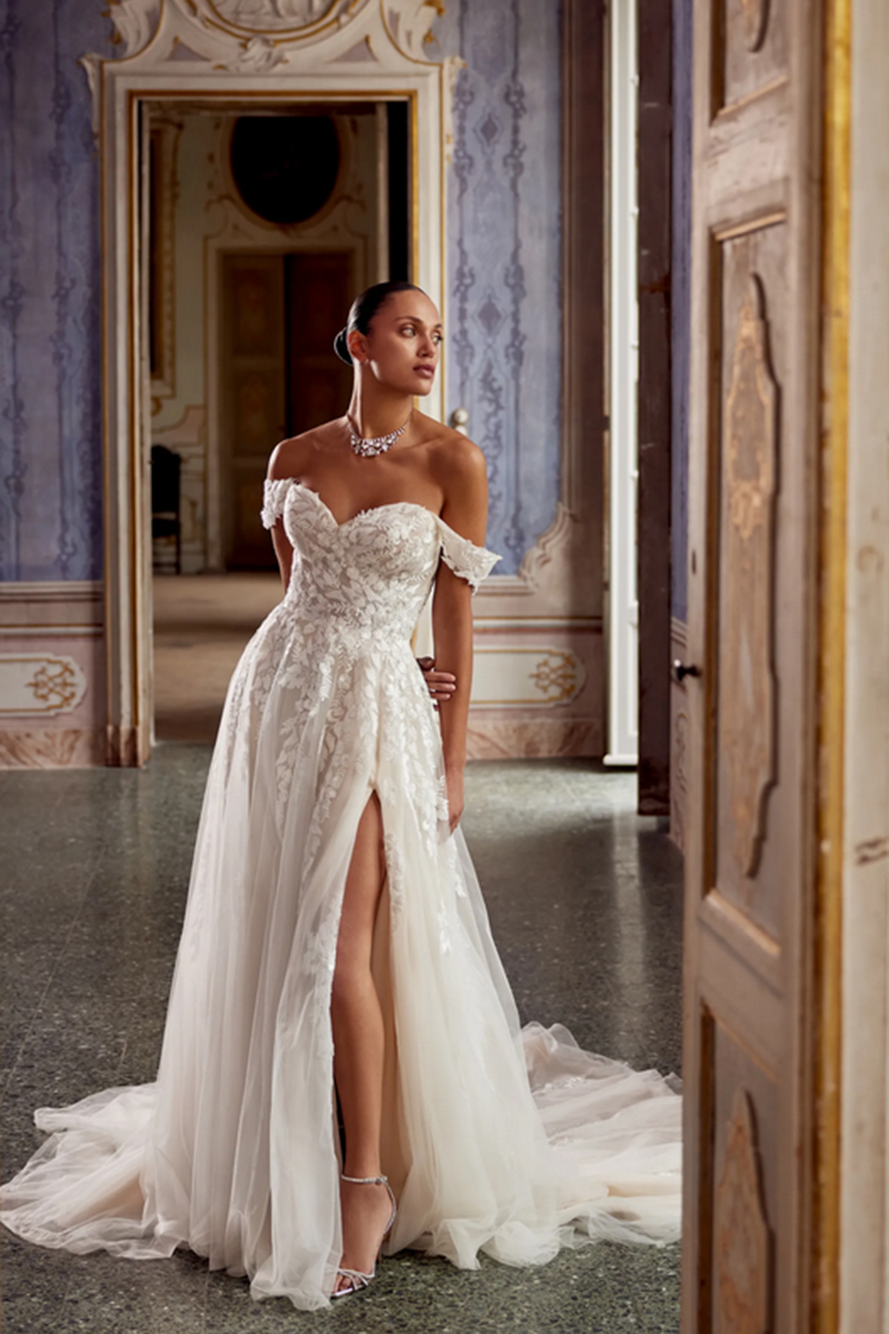This romantic sweetheart neckline wedding dress is simply stunning. Detachable straps create an Off-The-Shoulder neckline, while modern leafy lace appliqués adorn the illusion bodice and cascade down the tulle A-line skirt. The look is finished off with a sexy slit and buttons down the back. If preferred, the option to order this style without the slit is available.