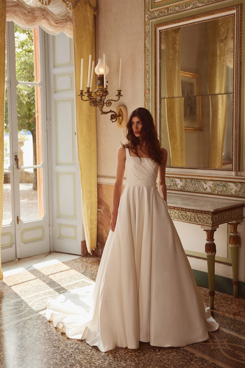 Satin Ball Gown with Square Neckline and Asymmetric Bodice and Pockets