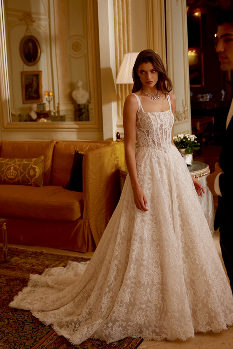 Allover Lace A-Line Gown with Sheer Corset Bodice and Basque Waist