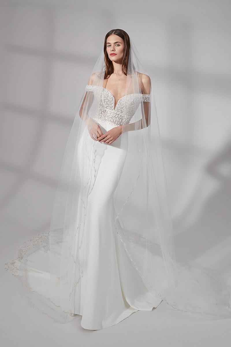 Feel glamorous wearing this off-the-shoulder fit and flare wedding gown. The bodice features a plunge at the neckline with a Chantilly lace underlay and beaded embroidered appliqués that create a gorgeous leaf motif. A cummerbund at the waist leads into a crepe skirt that reveals an opulent illusion train. The look is completed with a matching cathedral length veil, available separately.