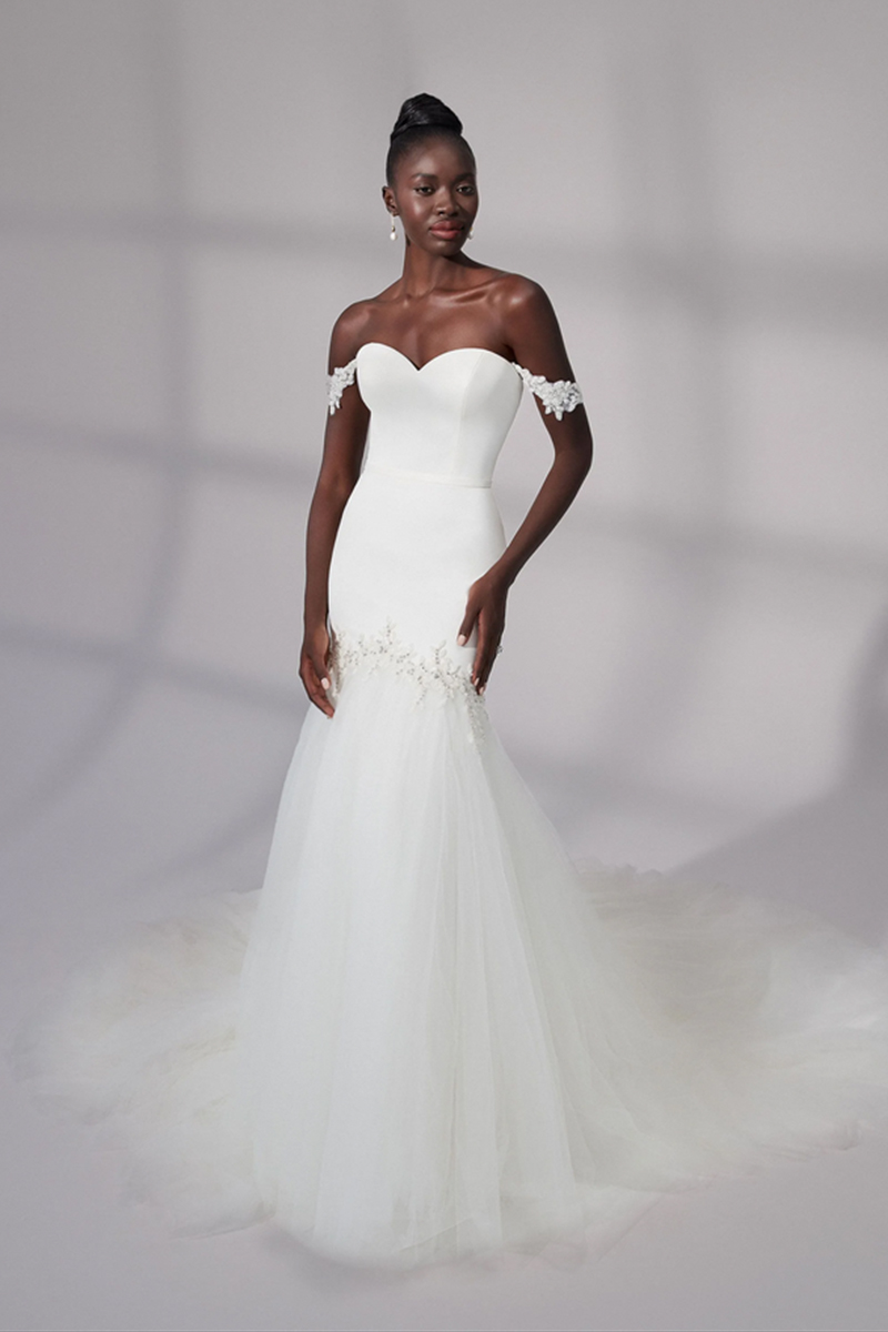 This trumpet wedding gown is for the fashion-forward bride. Luxurious satin is met with layers of soft tulle forming a full trumpet skirt. With a sweetheart neckline and detachable satin belt at the natural waist. Featuring gorgeous bead work embroidered in a floral motif to create detachable off the shoulder straps and adorn the top of the skirt. Finished with an invisible zipper and chapel length train.