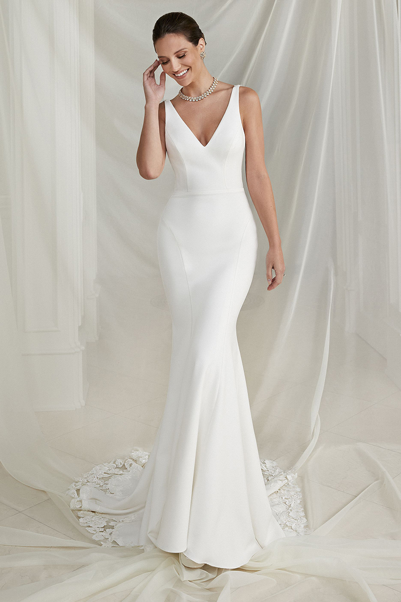 Feel your absolute best in this crepe fit and flare wedding dress. Done with a V-neckline, the back bodice uses sequined lace appliqués to create a low keyhole detail for a modern touch. The appliqués extend to create a romantic cutout chapel length train that catches the eye. Curve defining seaming on the front and back is an added detail that will flatter your figure. The style is complete with a jersey lining to ensure you will be more than comfortable dancing the night away!